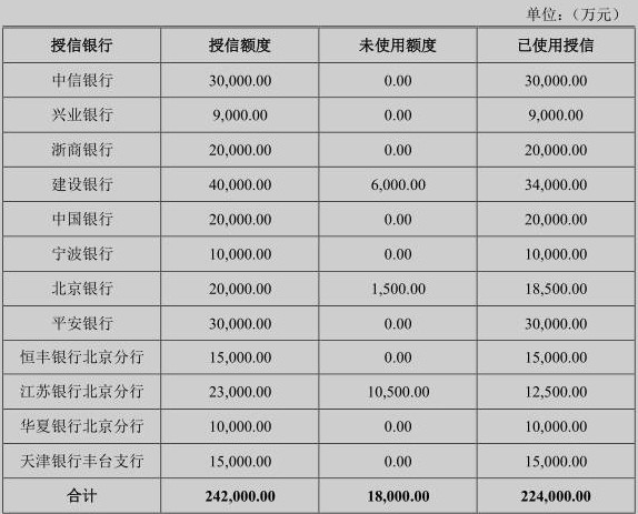 根据乐视公司债的募集说明书(申报稿)显示,截至去年6月底,乐视网在中信银行、兴业银行、浙商银行等多家银行的授信金额均已大部分使用。乐视网在12家银行的授信额度为24.2亿元,已使用额度为22.4亿元,使用率达92.6%。