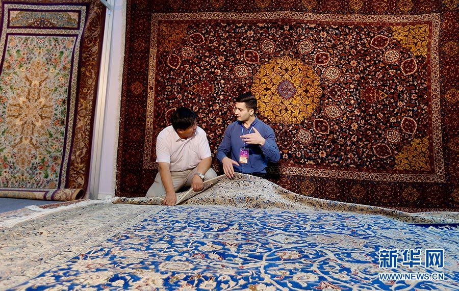 一位伊朗参展商(右)正在给顾客介绍地毯。(图片来源:新华网 张洁龙摄)